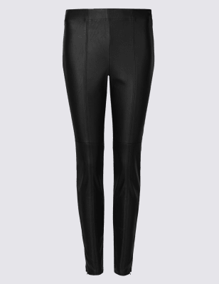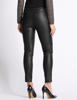 Faux leather now at M&S and I saw these today in the flesh. They are definitely more of a jegging than a trouser. So if you are looking for ones where you're not going to be flashing your waistline (like I am in the skinnies anyway - that boat sailed years ago), then these may work for you. I find the look completely different on ones with a zip button fly as opposed to a pull on legging style. But if you're looking for a style to wear with longline tunics and oversized jumpers, these are perfect. I would also happily wear these with a longline blouse and blazer. Definitely a faux leather feel to them as opposed to coated or waxed. Clear as mud?