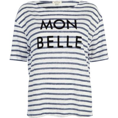 Blue Stripe Mon Belle linen T-shirt - £18 from RIver Island Here's where my hypocrisy knows no bounds as, whereas I criticise a poor defenceless pocket for being too fussy, I have no qualms at all about graffiti all over my stripes. I love this. Absolutely love it.