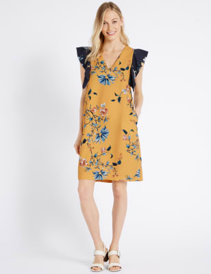 Floral Print Ruffle Sleeve Shift Dress from M&S £45 And.. they do also do cropped trousers to match these. This, over black skinnies would be a great night out option too. Or obviously with the bare legs.